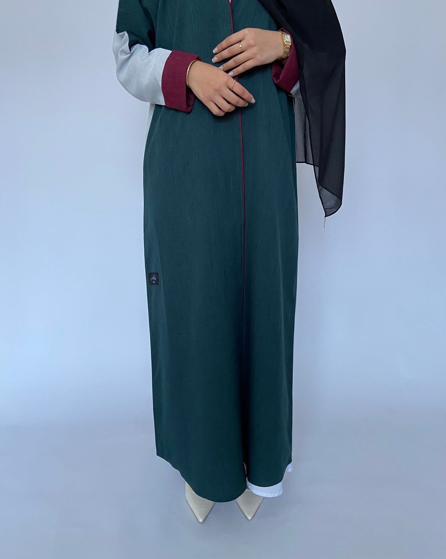 A two toned unique abaya design. A versatile piece that can be styled in different ways to match the colour of your choice. Elevate your style effortlessly by slipping your arm into the hidden sling to create a wrap abaya look.