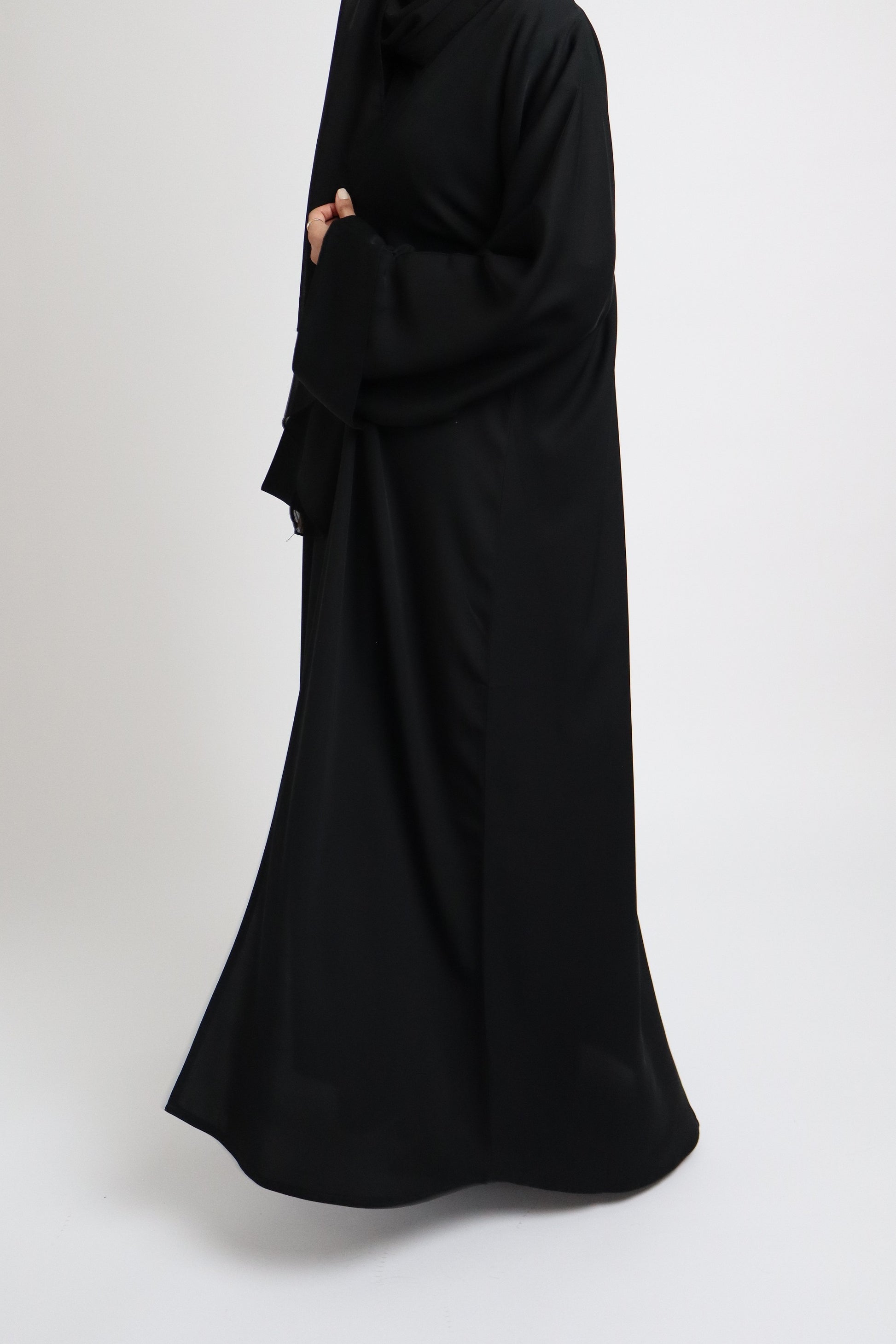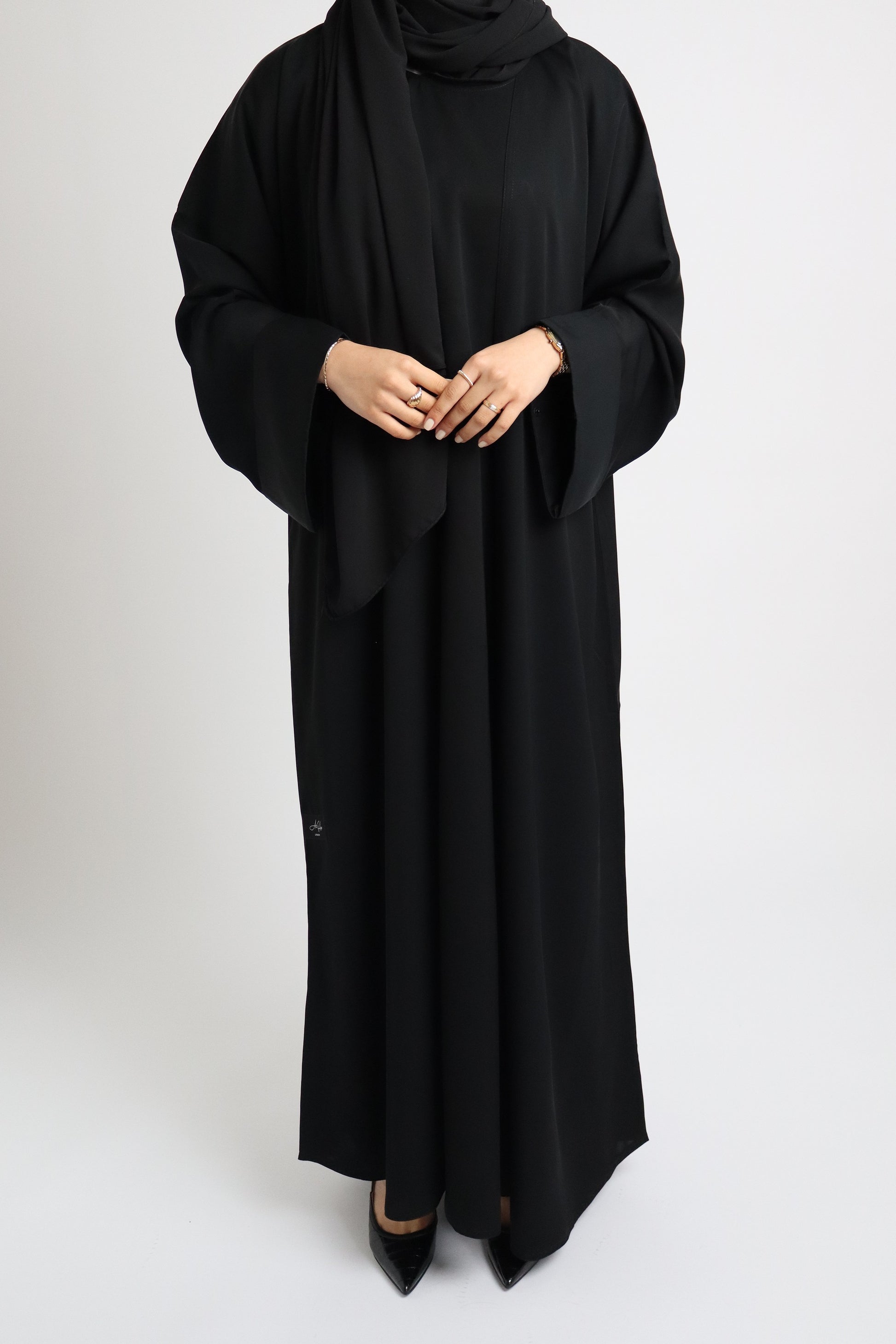 This premium Nida fabric abaya set includes an open abaya, slip dress, and hijab to complete your look. Crafted from breathable fabric and featuring a modest cut, our collection ensures both comfort and style for any occasion. This versatile abaya set can be worn with or without the slip dress.