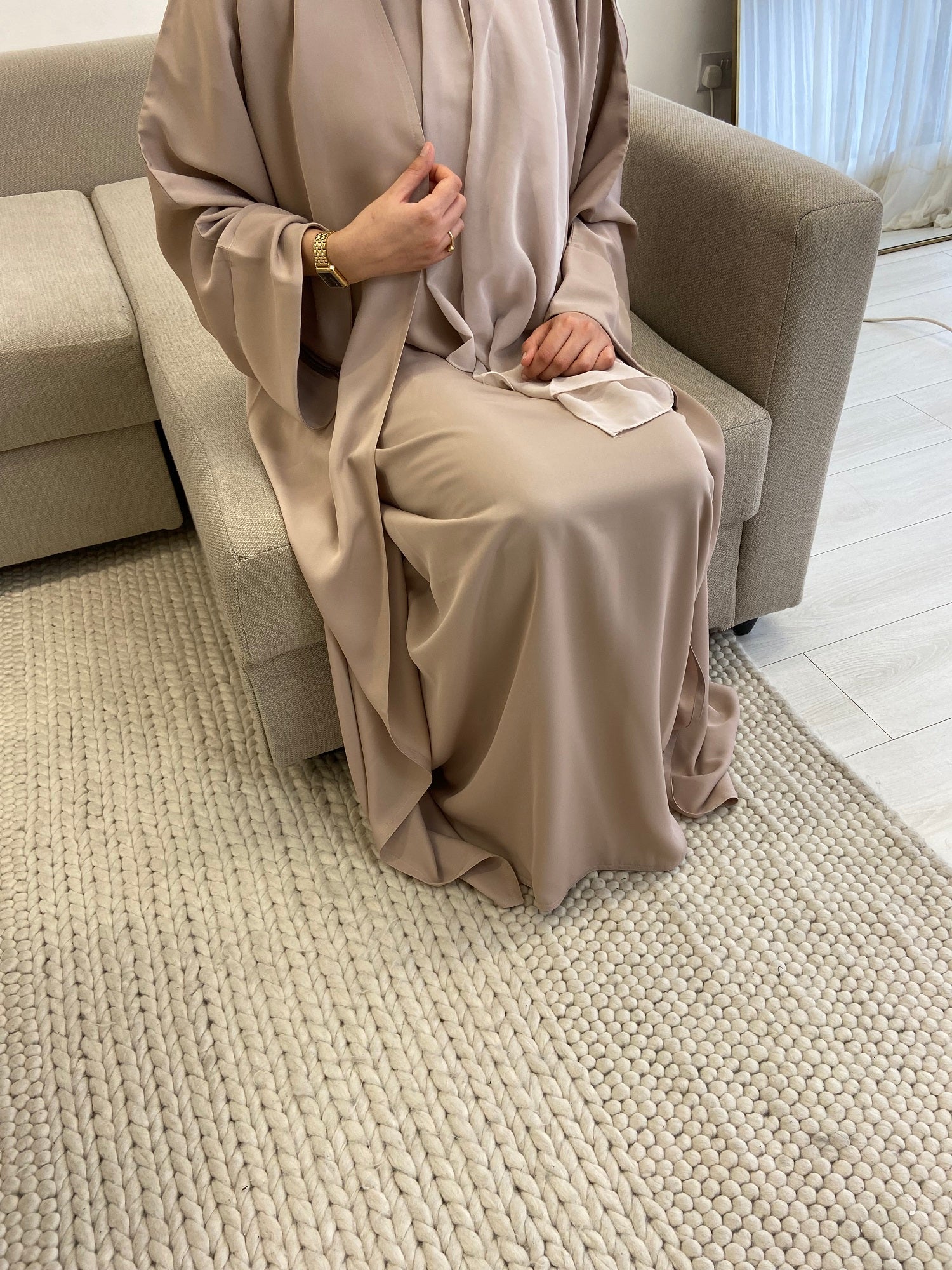 This premium Nida fabric abaya set includes an open abaya, slip dress, and hijab to complete your look. Crafted from breathable fabric and featuring a modest cut, our collection ensures both comfort and style for any occasion. This versatile abaya set can be worn with or without the slip dress.