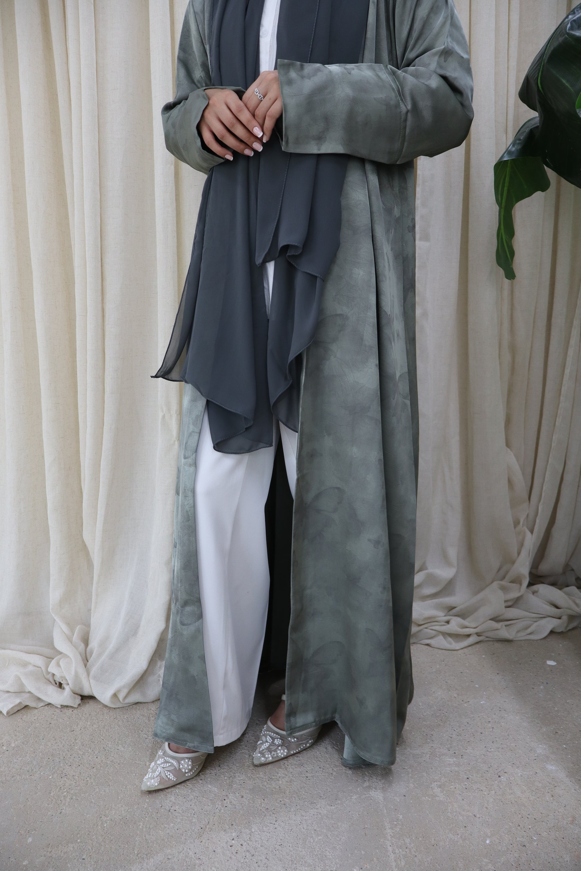 Butterfly Print Abaya - A soft a-line cut abaya crafted from a printed silk-touch fabric with delicate butterfly impressions. Designed with subtle sleeve slits that maintain full coverage. Each piece is paired with a matching wide emirati chiffon hijab to complete the look.