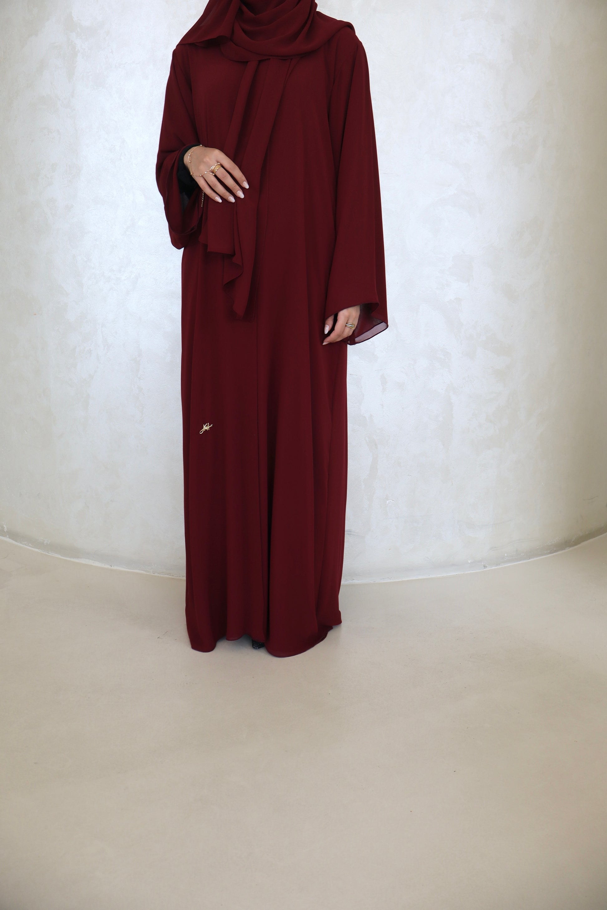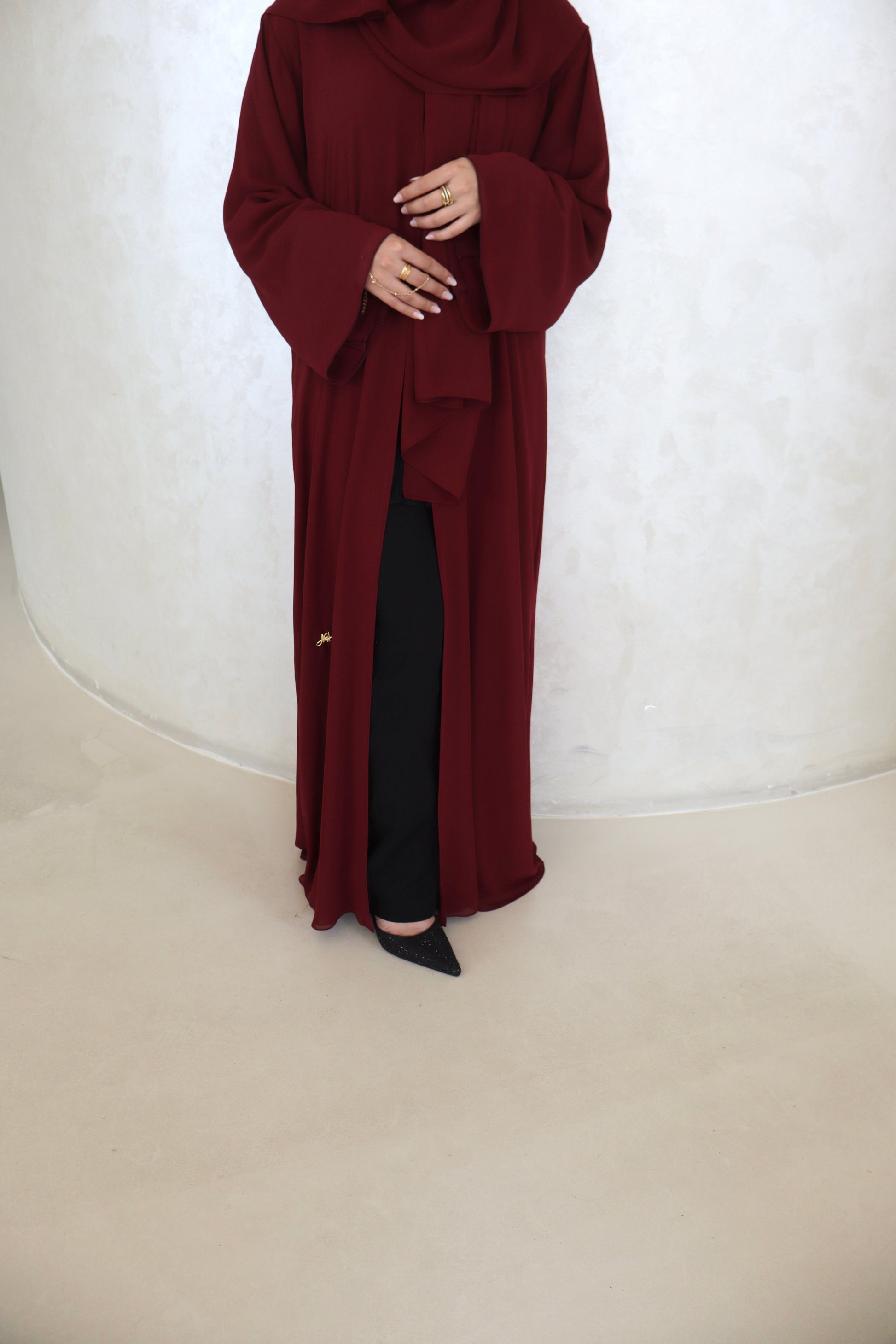 A double-layered chiffon abaya designed to create a flattering drape and effortless elegance. The lightweight, breathable fabric offers both comfort and effortless style. Each piece is paired with a matching wide emirati chiffon hijab to complete the look.