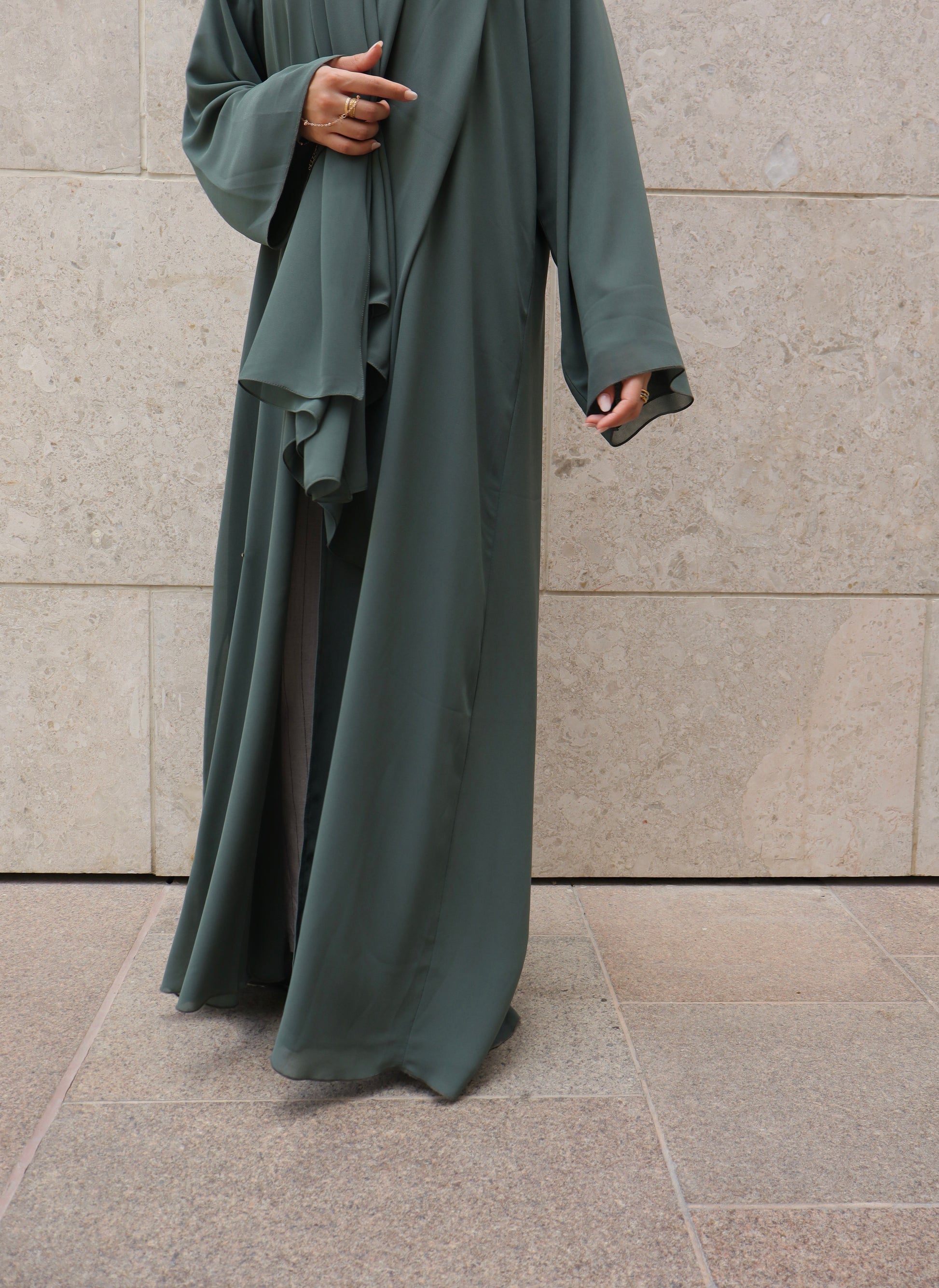 A double-layered chiffon abaya designed to create a flattering drape and effortless elegance. The lightweight, breathable fabric offers both comfort and effortless style. Each piece is paired with a matching wide emirati chiffon hijab to complete the look.
