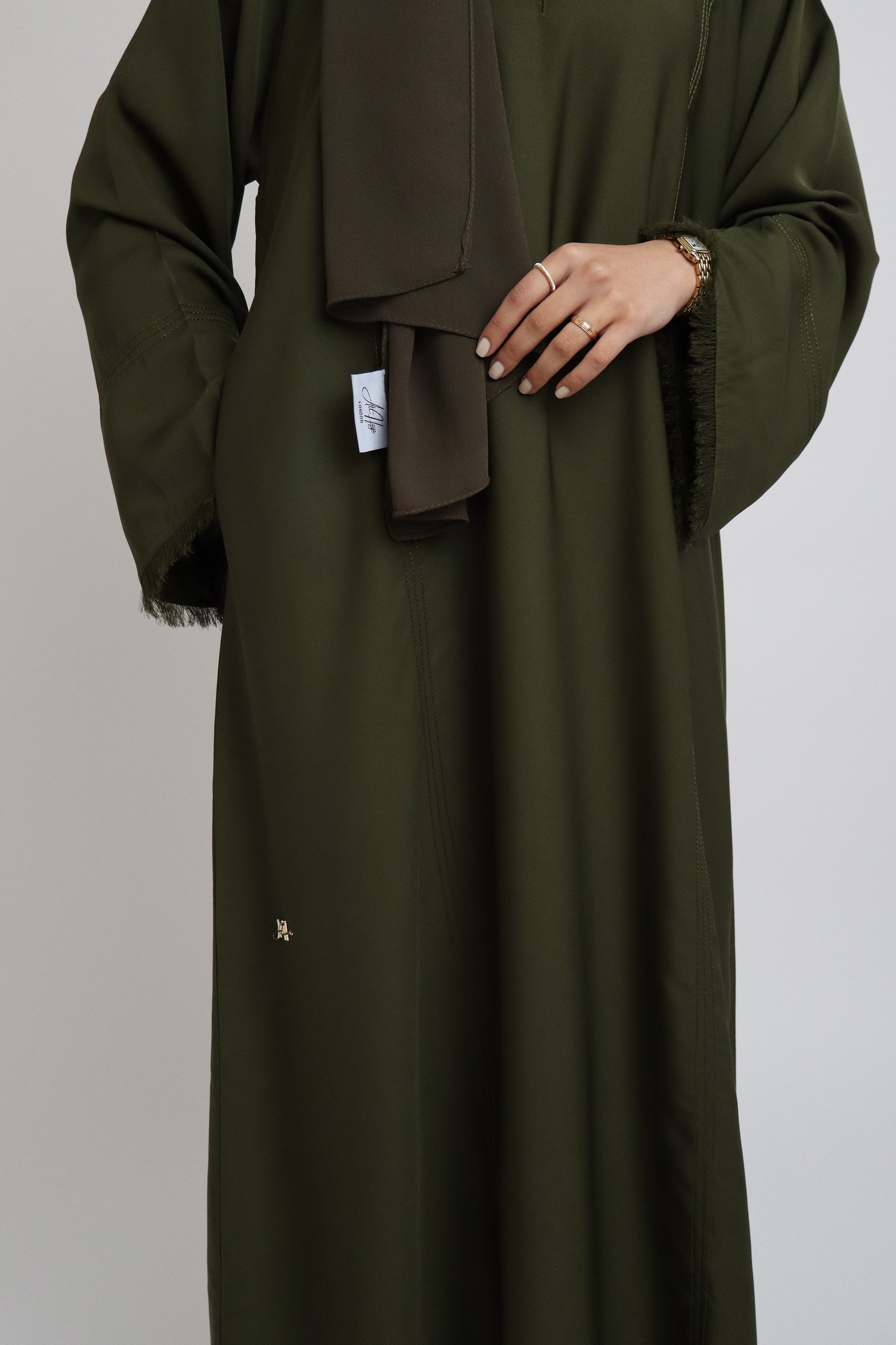 A perfect blend of simplicity and elegance, featuring delicate stitch lines and soft fringes for a unique touch of style. This abaya includes a side pocket.