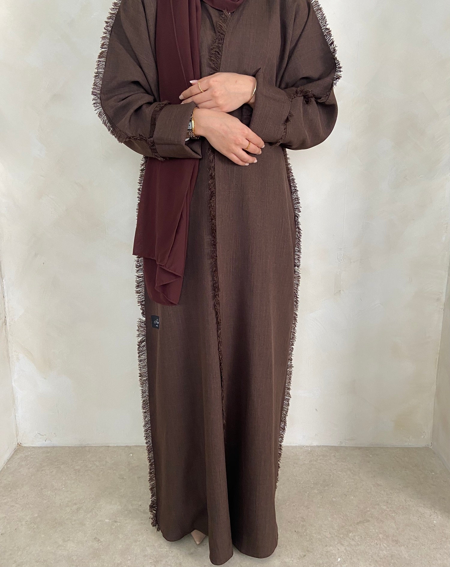 An open abaya featuring fringe lace details – where style meets comfort effortlessly. Elevate your abaya collection and embrace the beauty of effortless style.