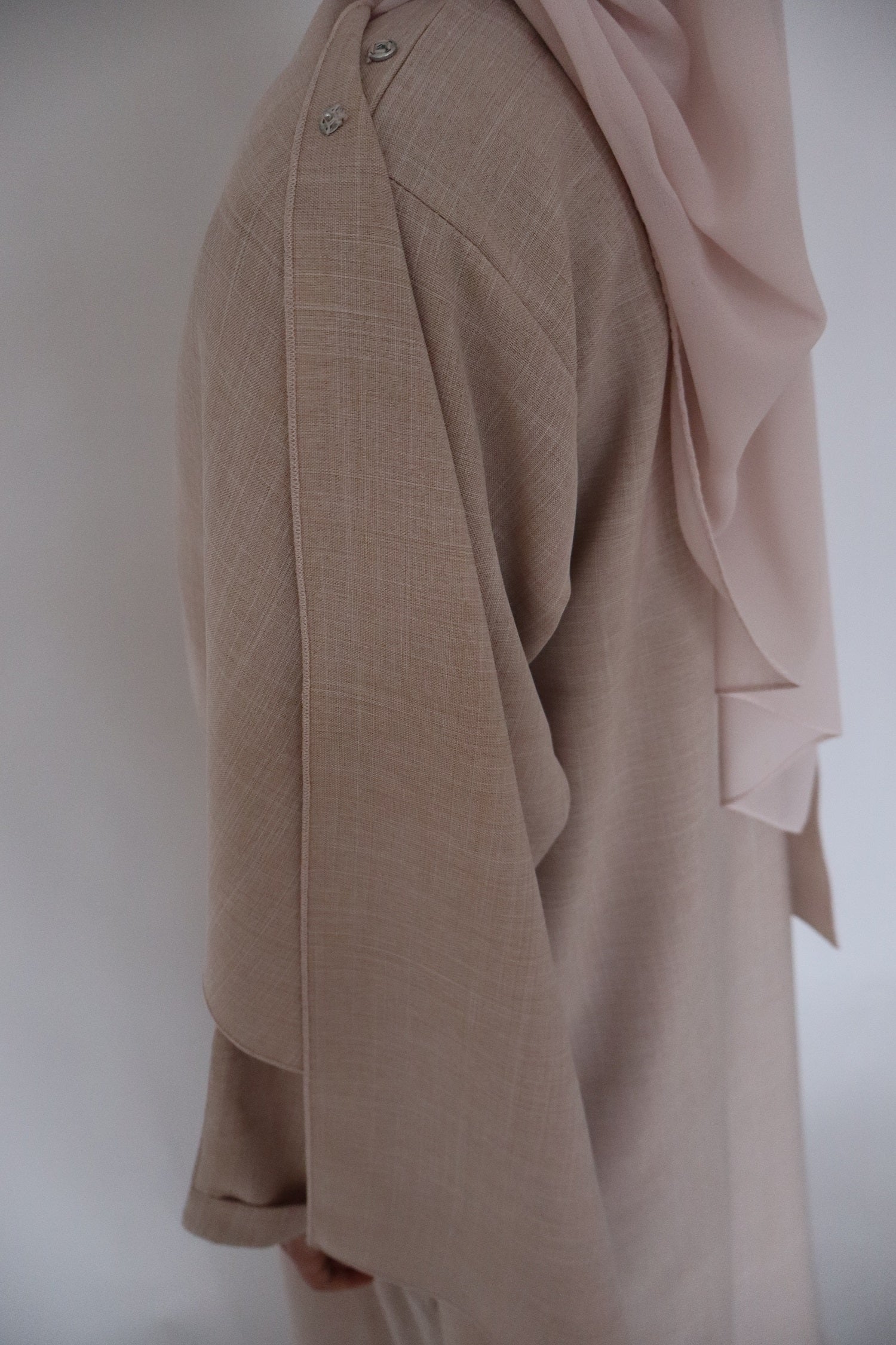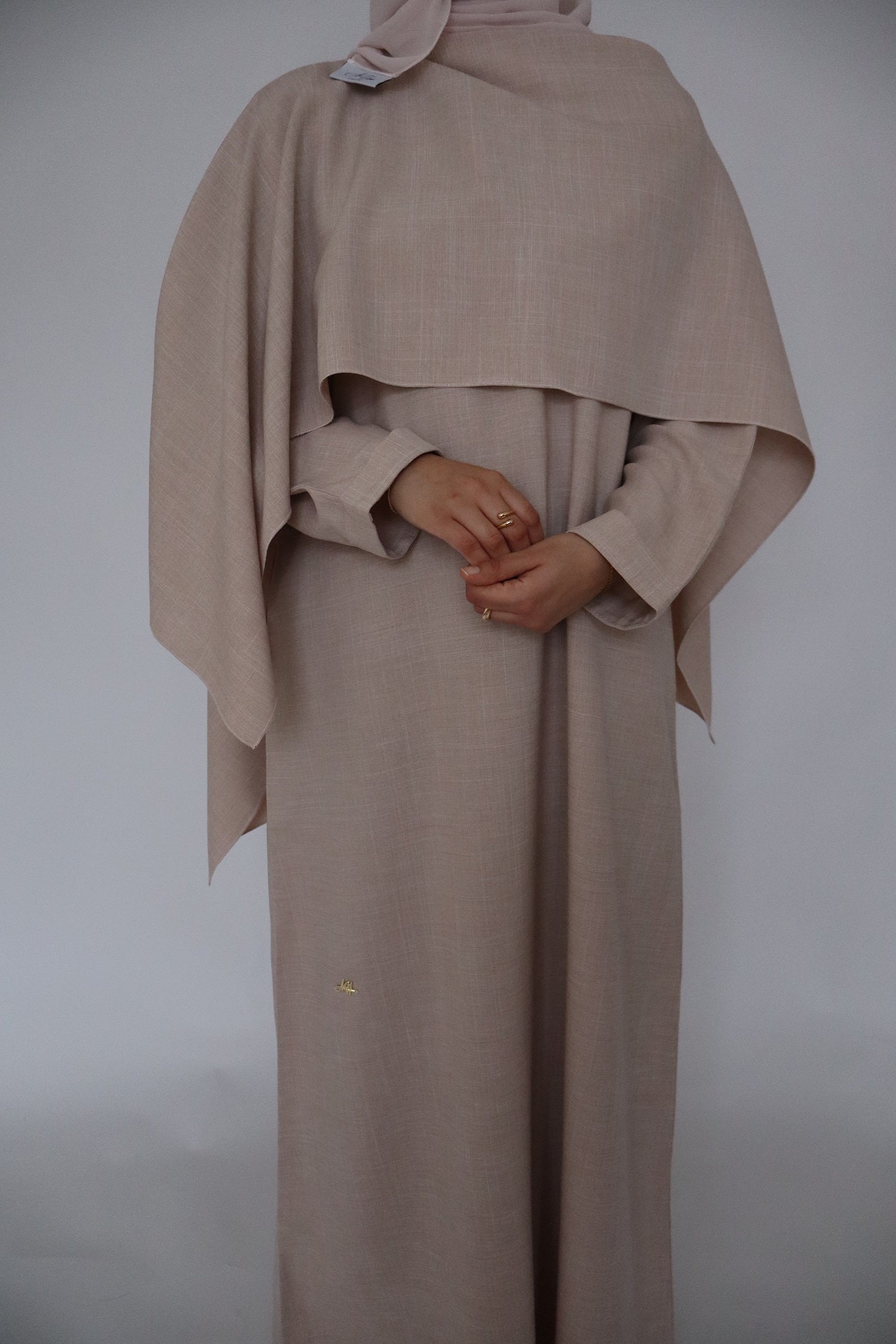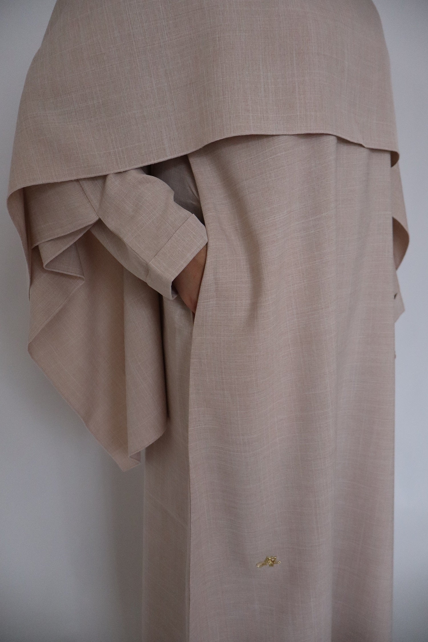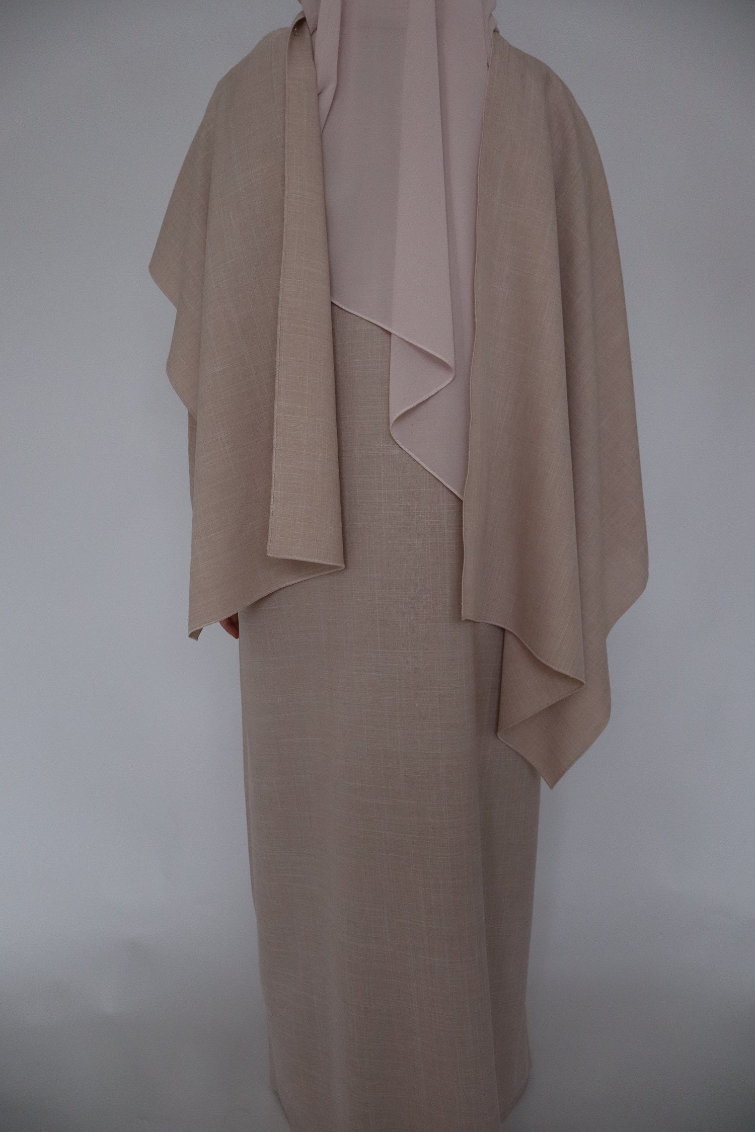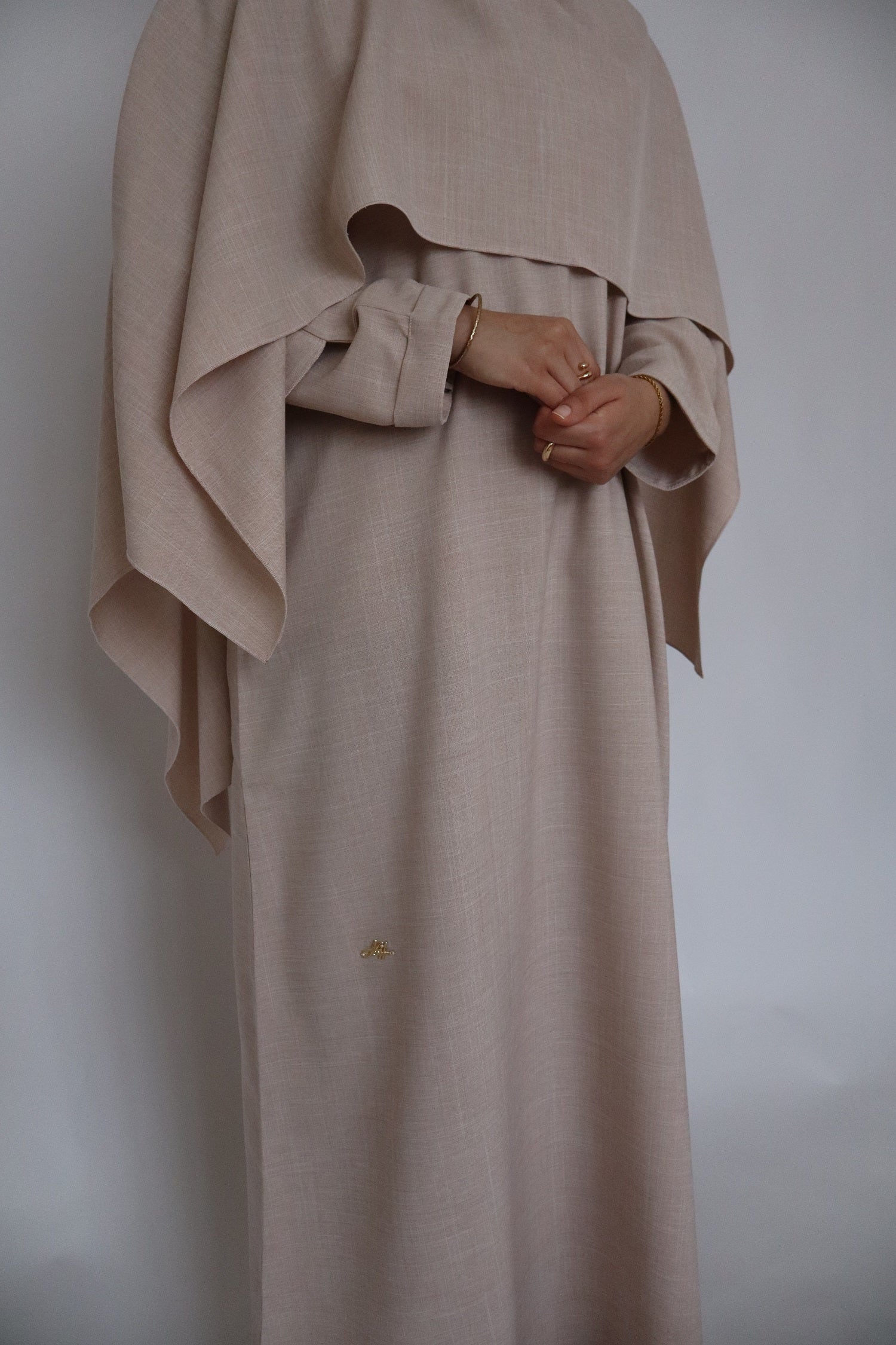 The Linen Scarf Abaya is made from high-quality linen fabric, it's both lightweight and comfortable, perfect for everyday wear or special occasions. Designed for practicality and style, it features an attached scarf with a popper button on the shoulder to ensure it stays in place all day. The abaya includes an essential side pocket and is finished with folded narrow sleeves for a sleek, modern look.