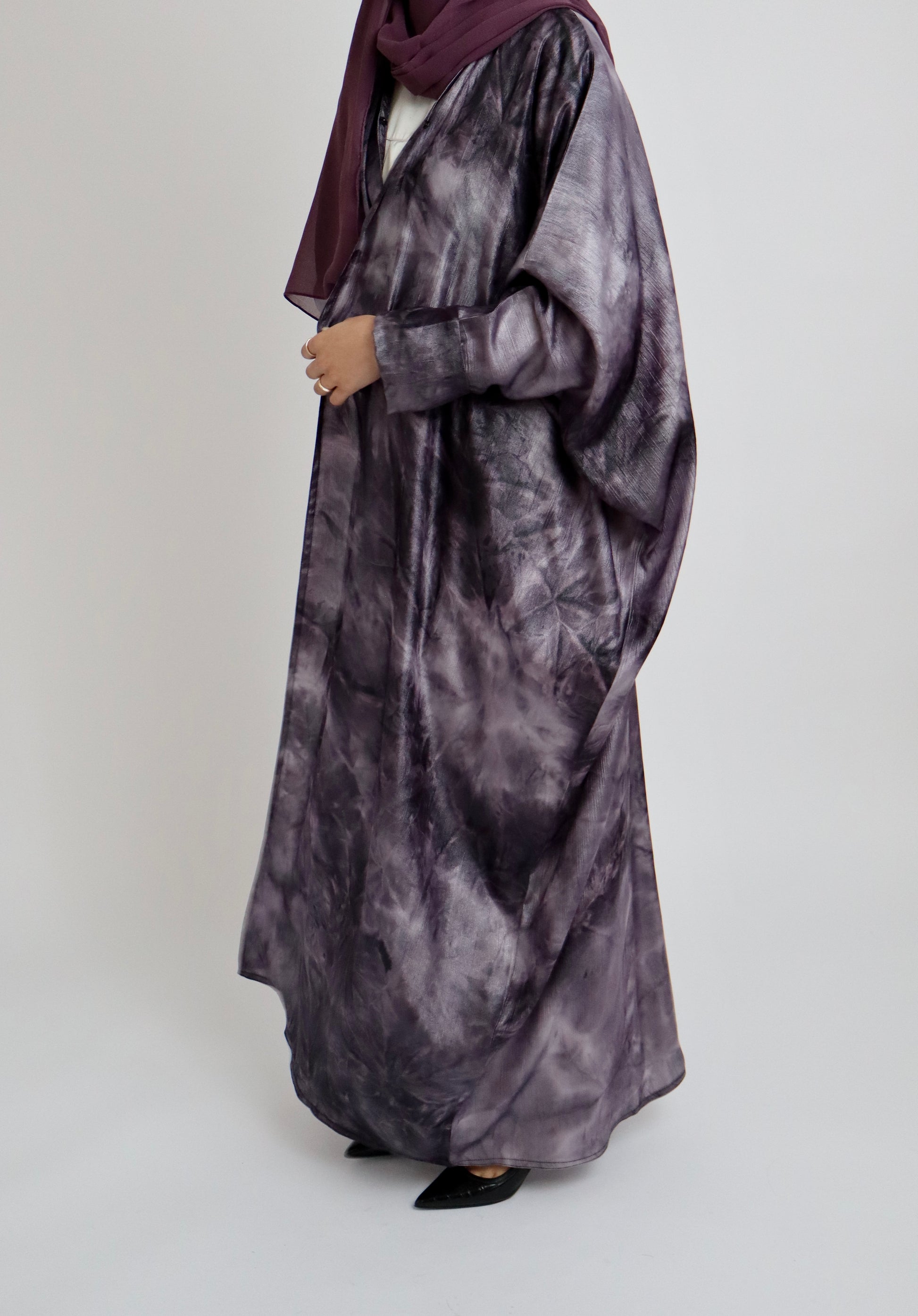 This lightweight batwing open abaya features a unique tie-dye marble effect with a subtle textured finish. Its relaxed design offers comfort and effortless style, perfect for any occasion. A modern twist on a classic piece, this abaya combines elegance with a contemporary look.