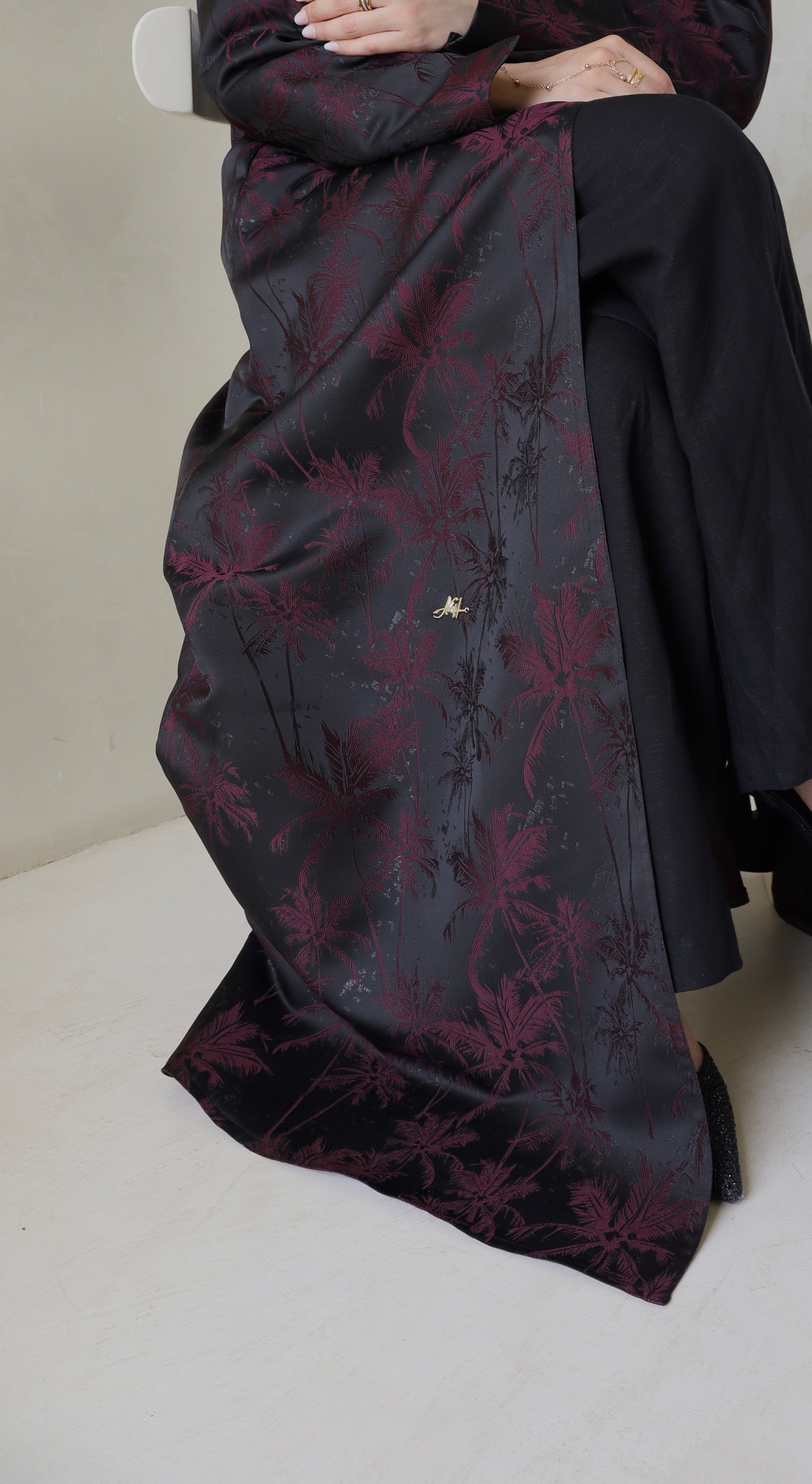 An elegant abaya with a delicate palm print, made from a thicker fabric for a structured, polished look. Designed with subtle sleeve slits for comfort and a touch of style. Each piece is paired with a matching wide emirati chiffon hijab to complete the look.