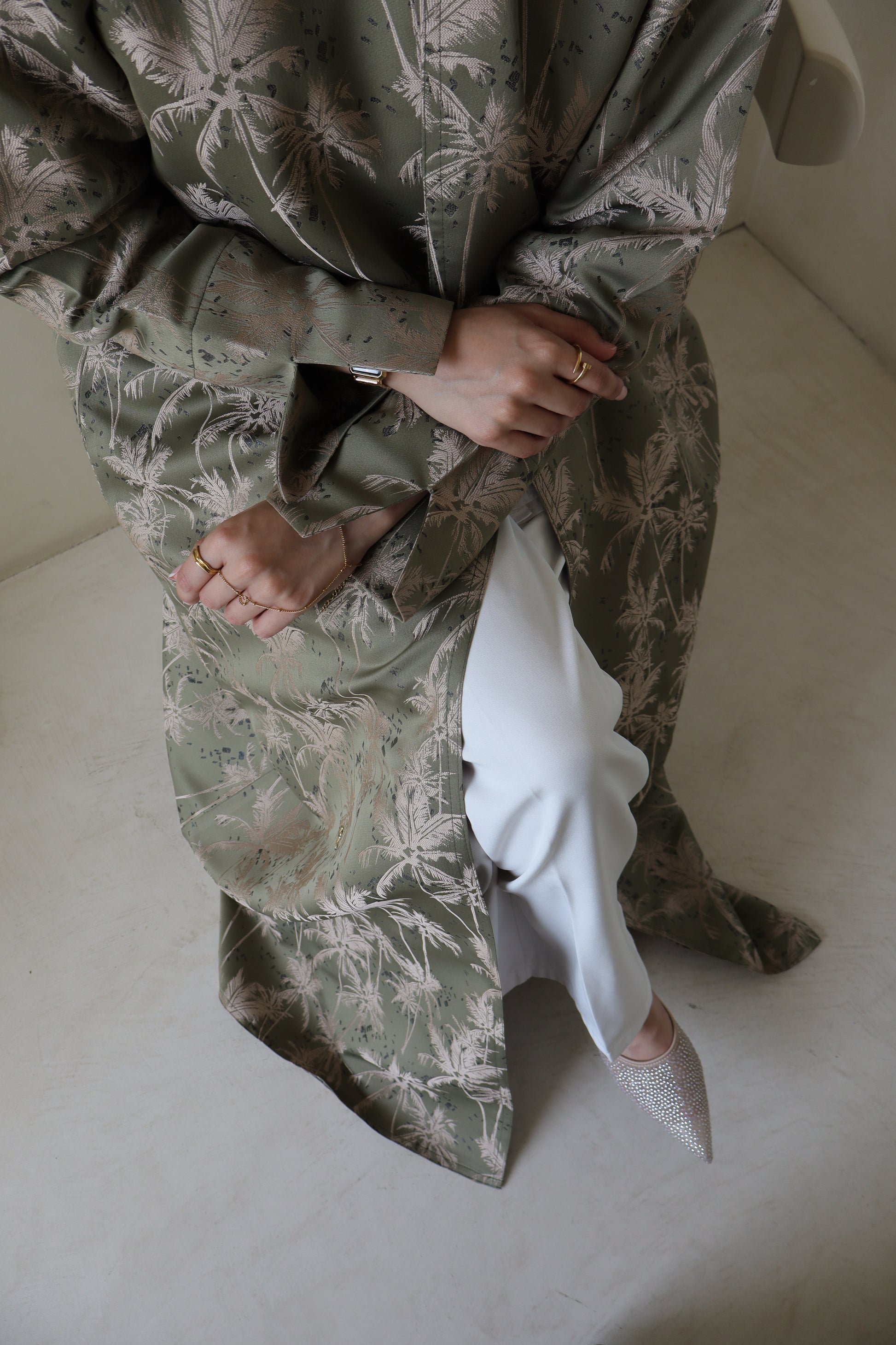 An elegant abaya with a delicate palm print, made from a thicker fabric for a structured, polished look. Designed with subtle sleeve slits for comfort and a touch of style. Each piece is paired with a matching wide emirati chiffon hijab to complete the look.