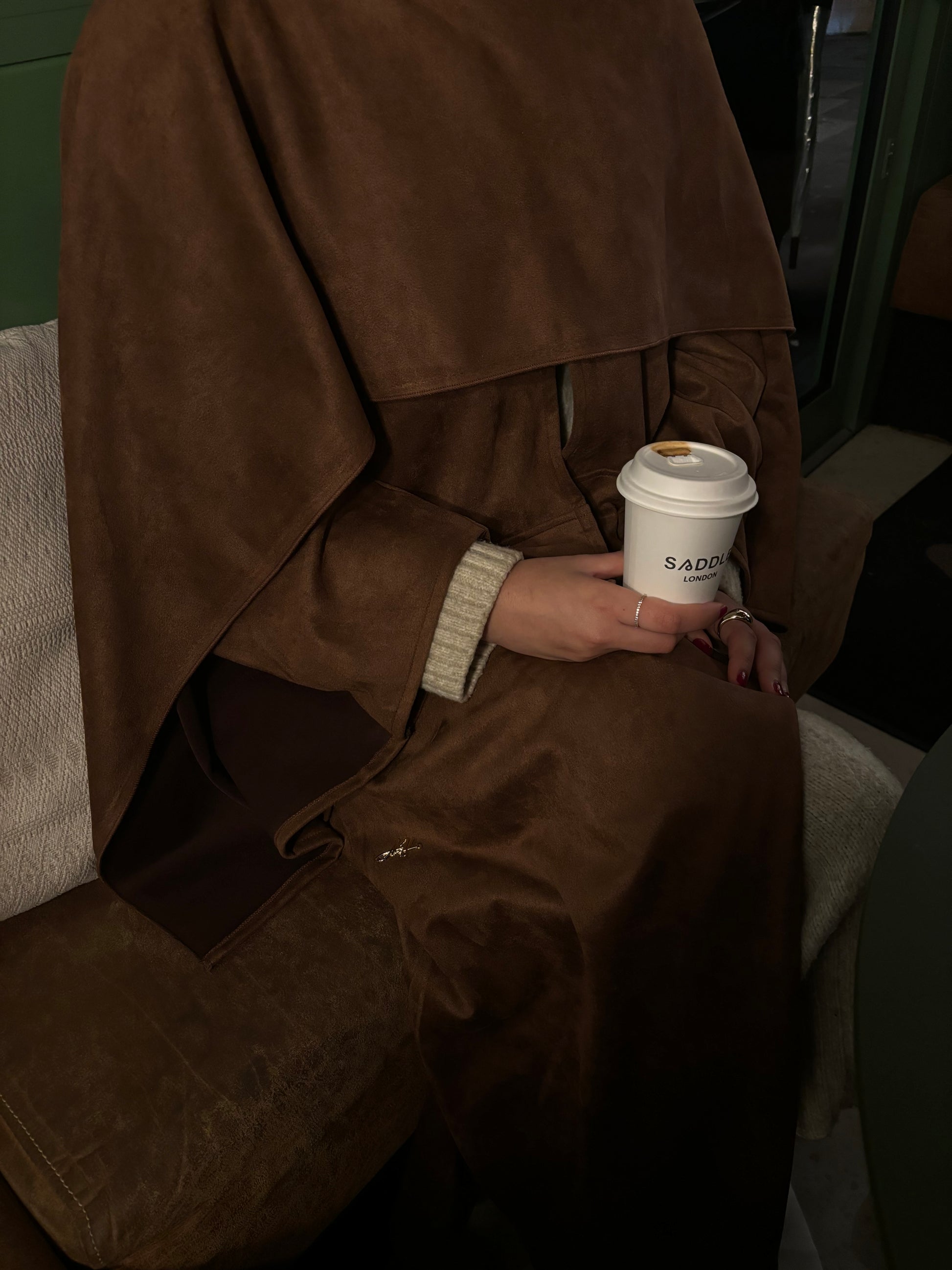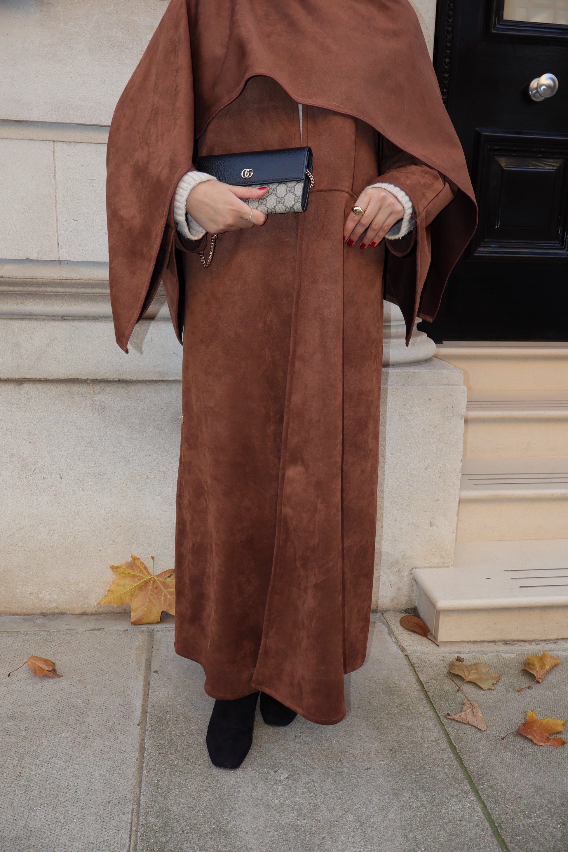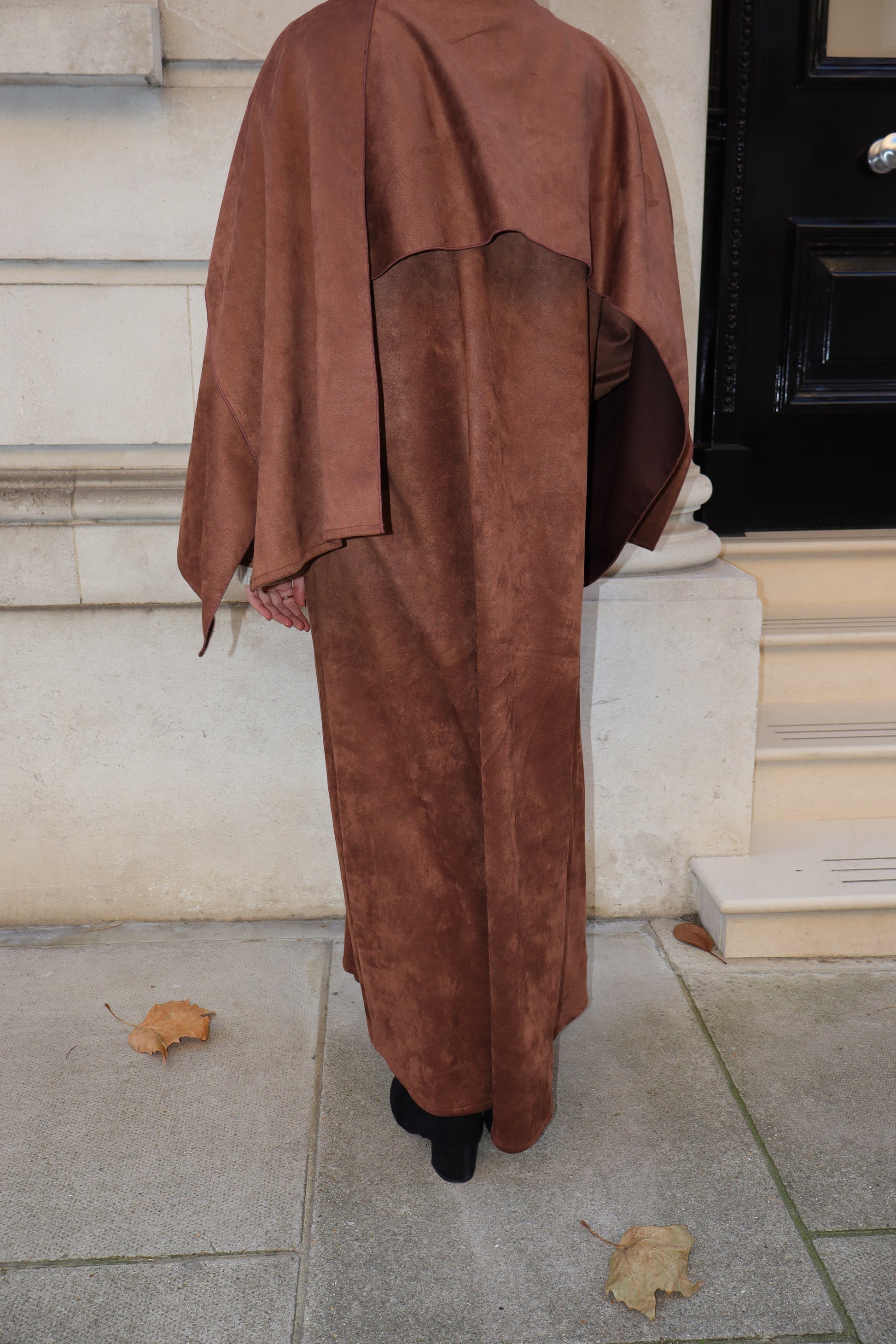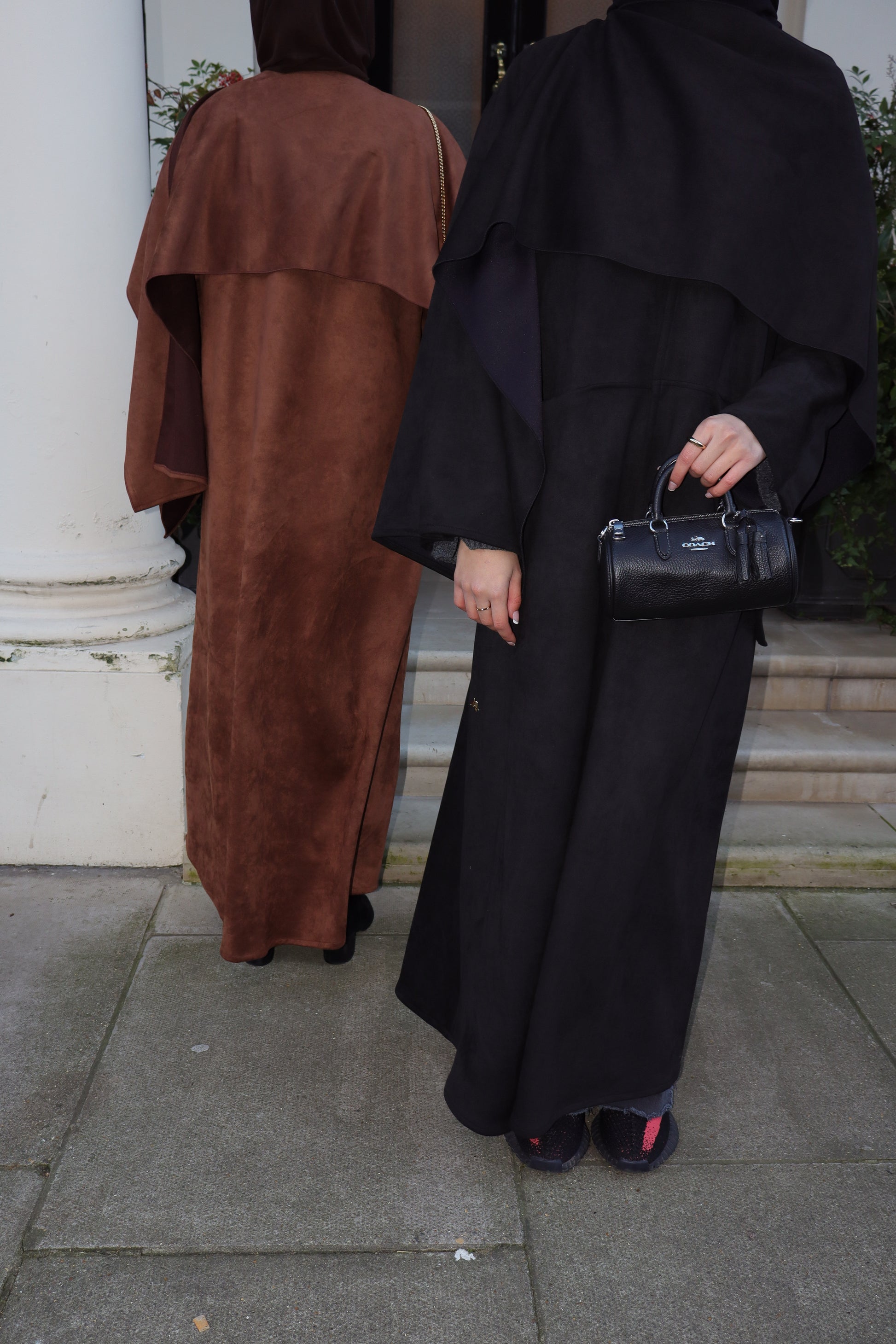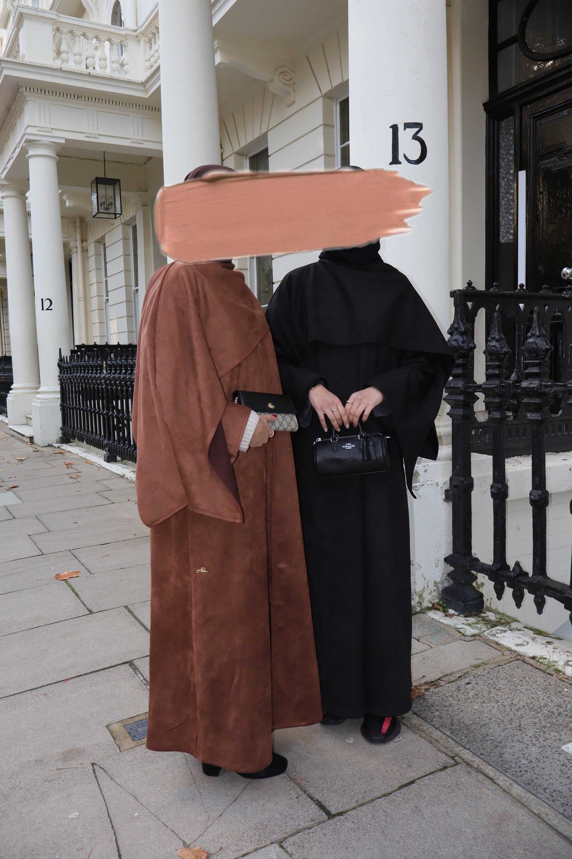 Our Suede Cape Abaya is designed with an attached scarf that drapes gracefully across the front and back, offering extra fabric to style over the shoulders. Complete with two hidden front pockets, this abaya combines elegance and practicality effortlessly.